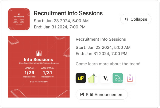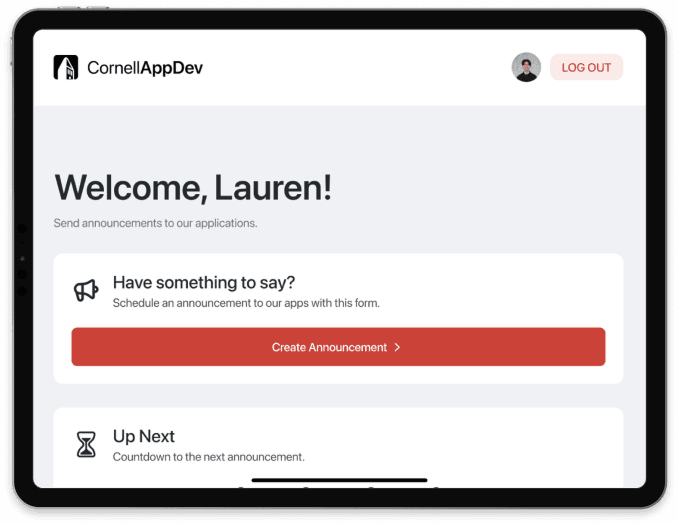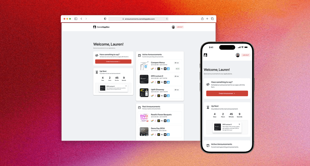 Announcements is Cornell AppDev’s internal web app designed to schedule, send, and manage one-time marketing blasts to 15,000+ MAU across 5+ products.