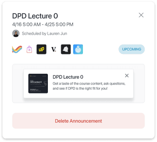 To view the full preview of the announcement, as well as secondary information like who scheduled the announcement, the user can click on the card, which opens a pop up. This pop up also serves as an entry point to editing or deleting an announcement.
