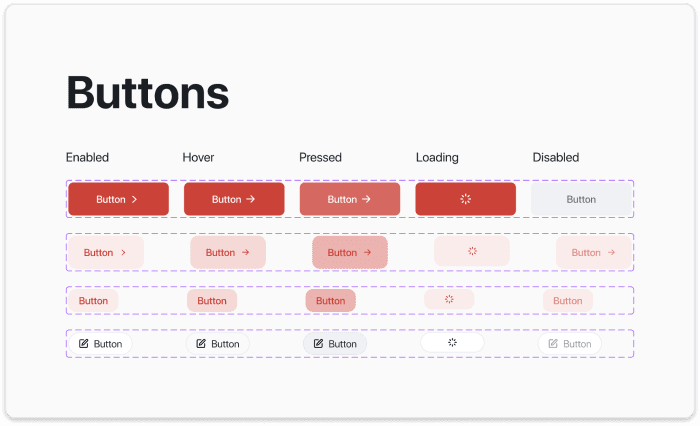 I established requirements for announcement forms, such as title, body, image, and apps. We wanted to be able to provide users with more information about the form as they filled it out. Thus, I built out buttons in our mini design system with multiple states (i.e. Enabled, Hover, Pressed, Loading, Disabled).