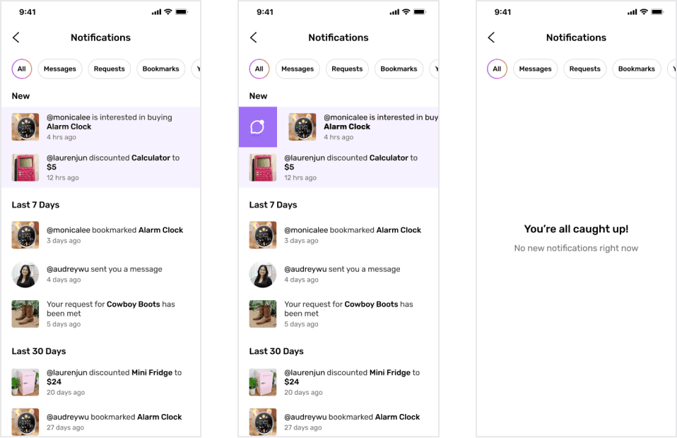 Notifications for requests let the user know that an item they’ve been looking for has been listed on Resell. We want the main focus of the copy to be the name of the listing and clearly state that their request has been heard.