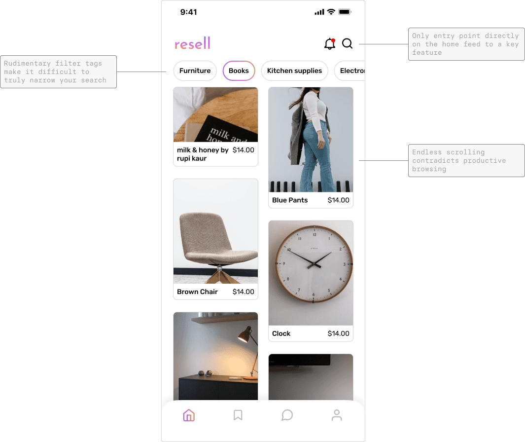The current home feed in Resell organizes listings by most recent and allows users to select a filter tag or search listings. Thus, the user is unable to narrow their search easily, preventing them from productively browsing Resell.