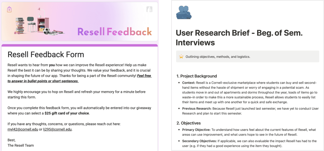 Before we could explore feature spaces, we resolved to conduct user research by setting up 1:1s and polling Resell users with questions via a feedback form. Through UXR, we hoped to learn more about users' current satisfaction with different parts of the Resell experience and what they feel Resell can do better.